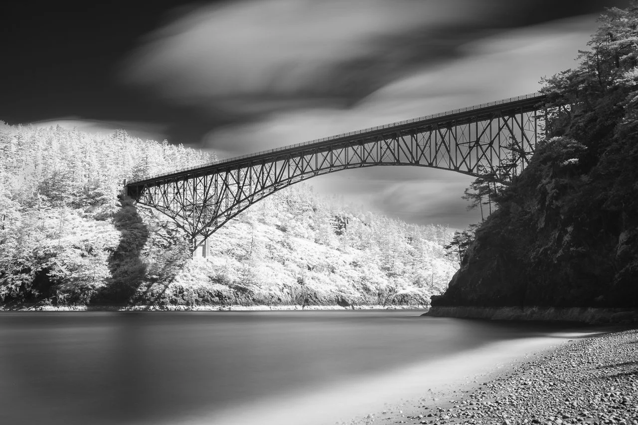 In April I participated in a workshop on long exposure IR photography that was held at Washington’s Deception Pass State Park. This log exposure (2.75 minutes) gives an ethereal feel to both the clouds and the water.
